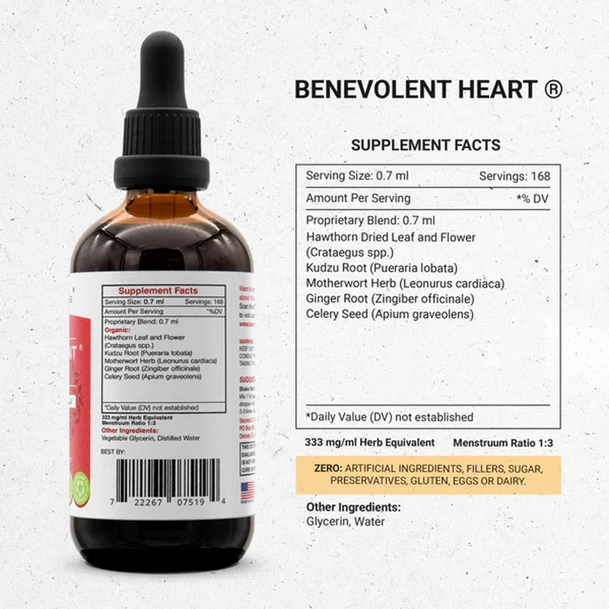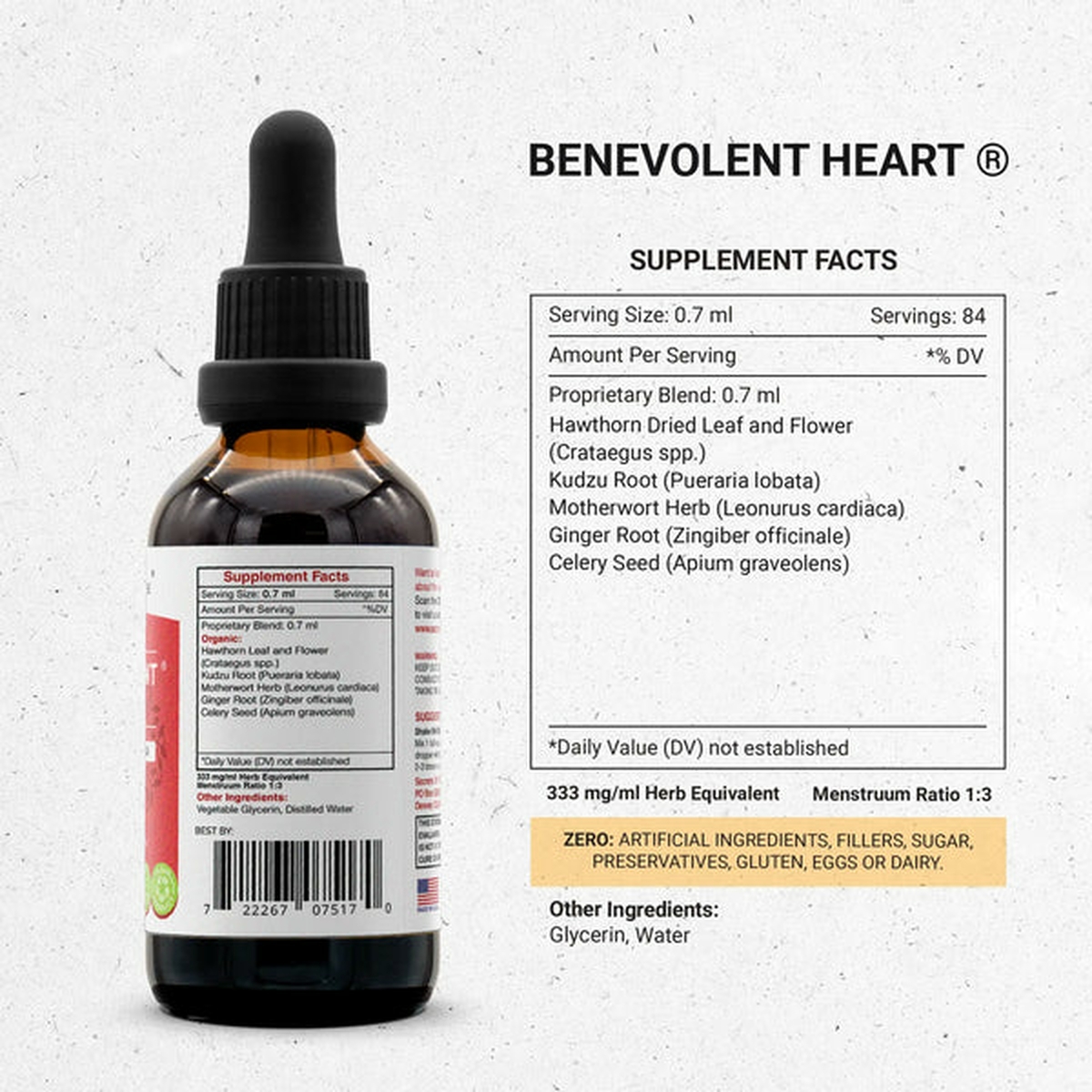 Our Benevolent Heart formula is a powerful blend of herbs traditionally used to promote heart health. It contains Hawthorn, Kudzu, Ginger Motherwort, Celery.