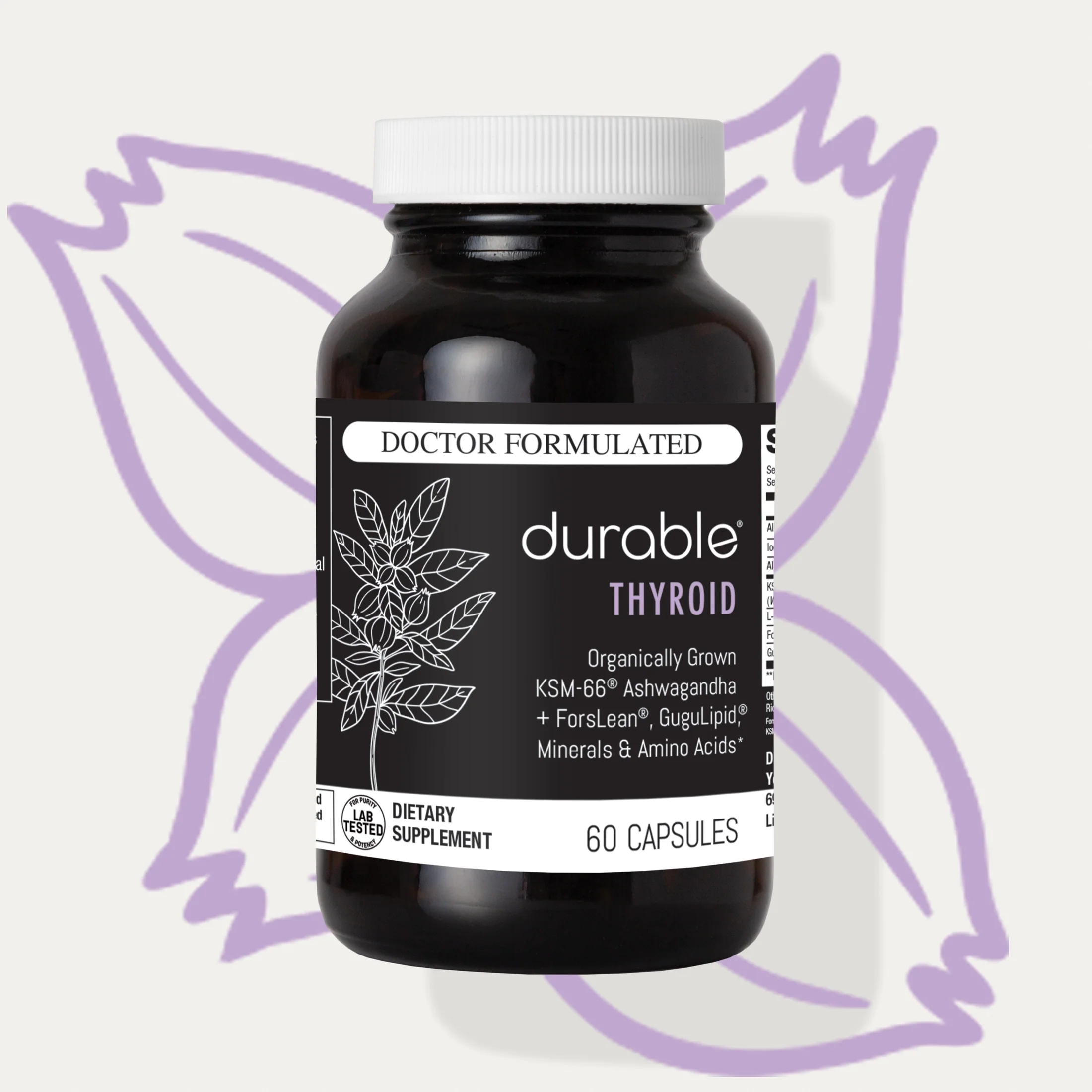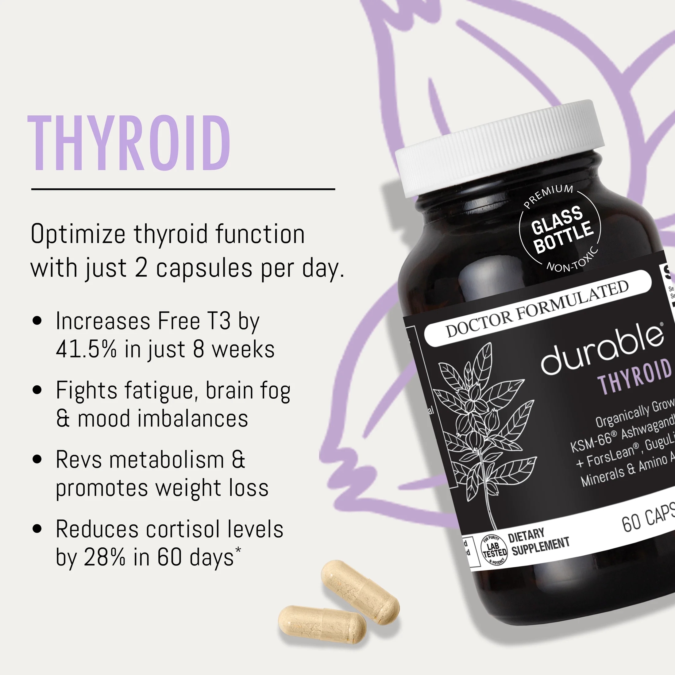 Doctor-formulated, science-backed Durable THYROID targets the most common underlying causes of thyroid dysfunction with powerful, clinically proven ingredients that support healthy thyroid hormone production, proper immune balance, stress resilience and overall metabolic health to help get you feeling like yourself again.
