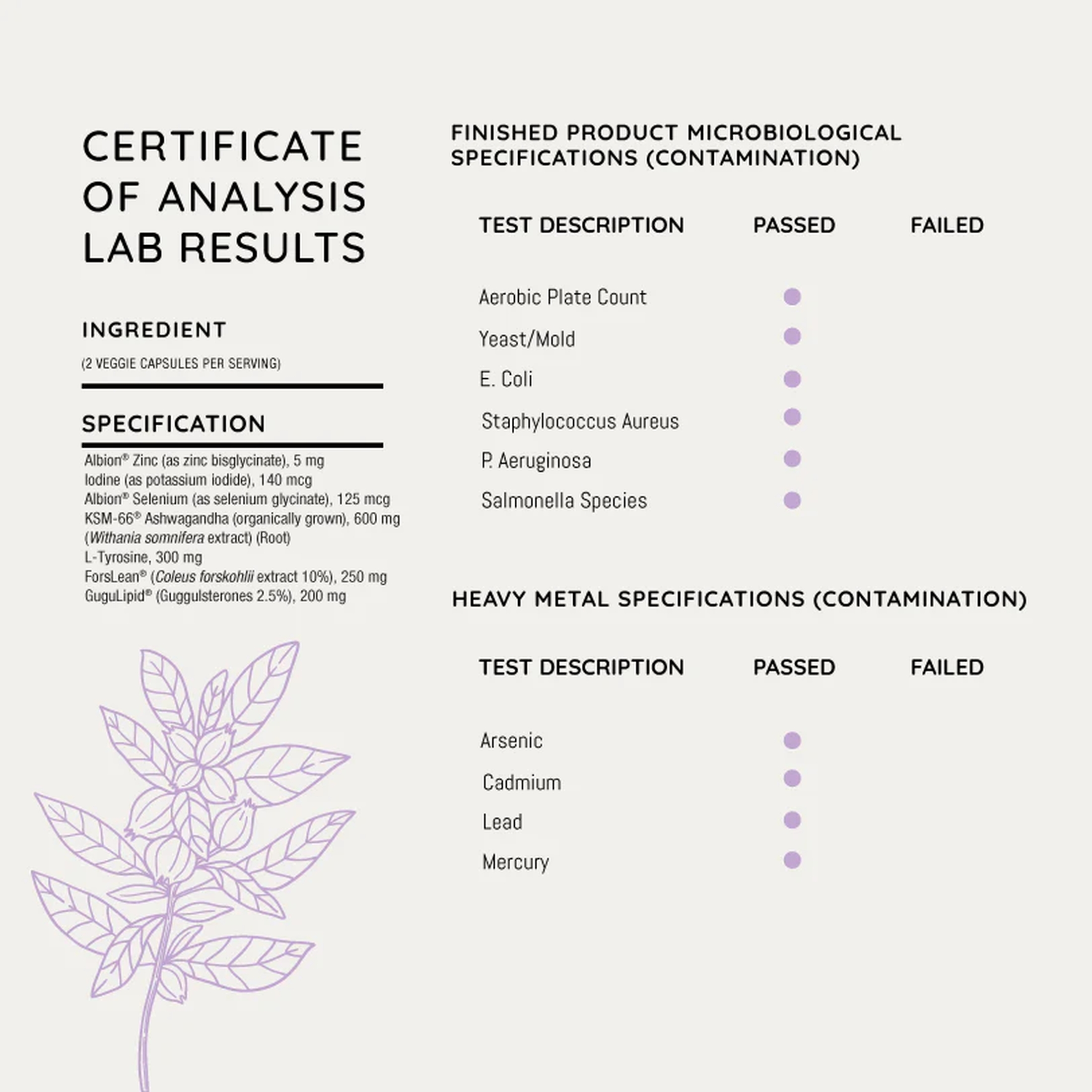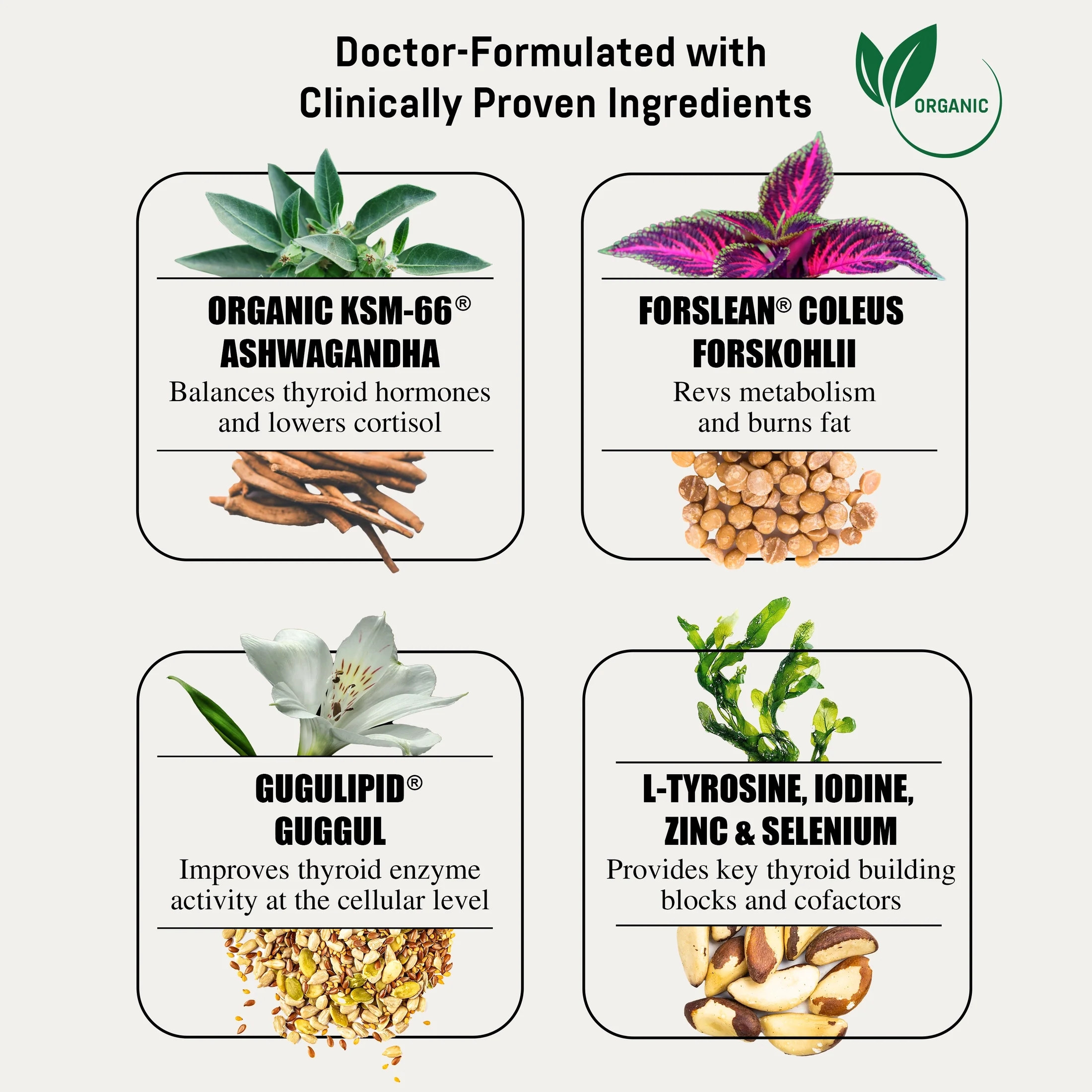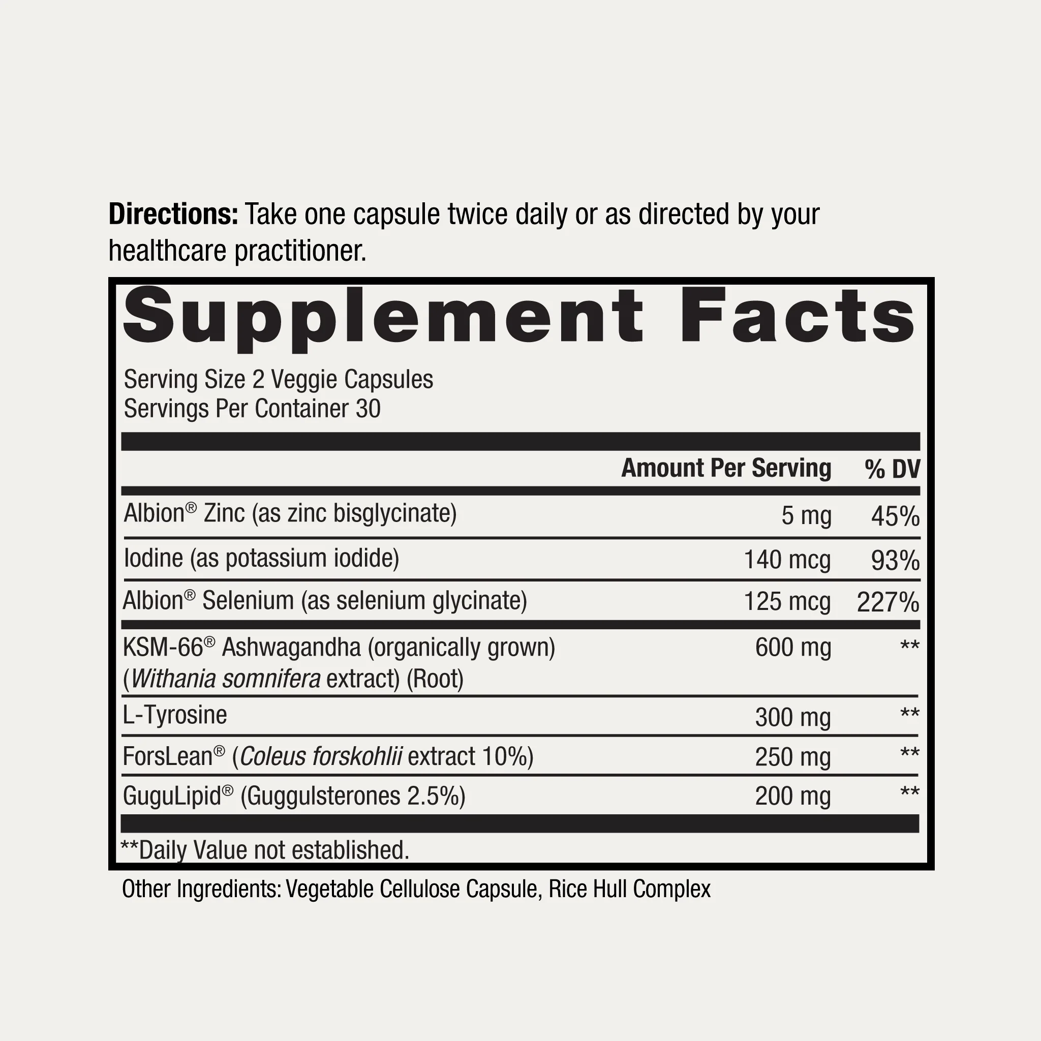 These patented, well-researched botanical extracts work synergistically with KSM-66® to stimulate metabolism and promote healthy thyroid hormone activity.