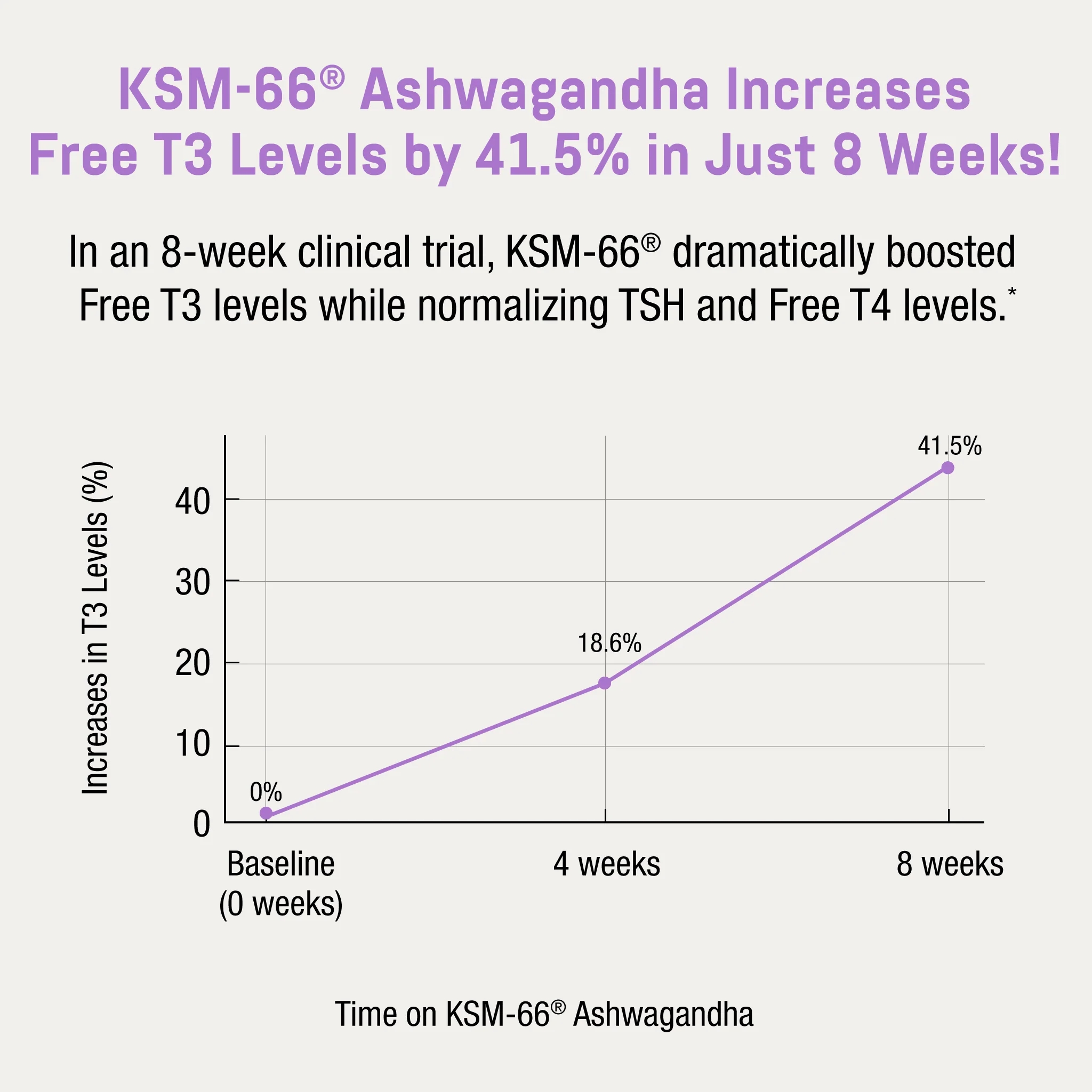 Made from sustainably harvested ashwagandha roots, this standardized extract is the most trusted and clinically studied ashwagandha extract in the world, backed by more than 50 clinical trials demonstrating it safety and effectiveness—and the only one proven to boost Free T3 by 41.5%.