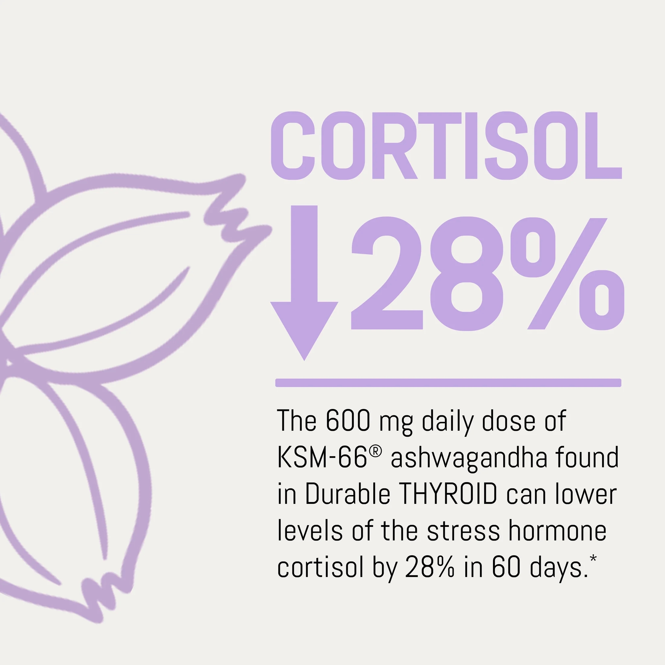 Durable THYROID is designed to support this conversion process by: Supporting your adrenals and reducing cortisol with KSM-66®—critical for proper thyroid function under stress